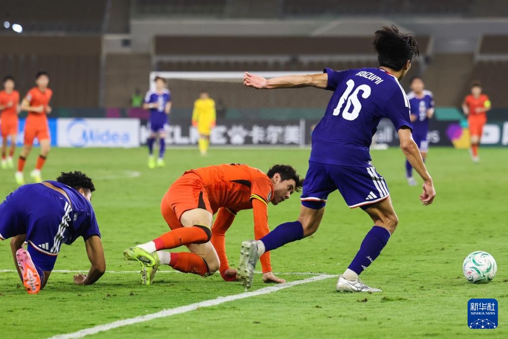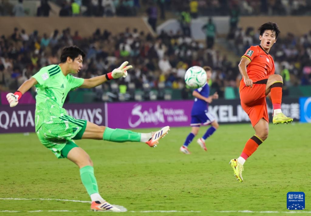 1月24日,中国队球员向余望(右)和日本队守门员荒木琉伟在比赛中。新华社记者 王海洲 摄