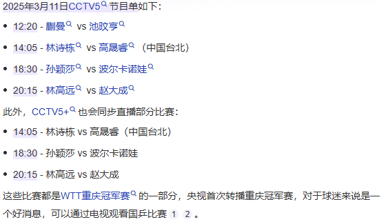 跟着今天的赛事告一段落体育录像/图片,3月11日央视体育频说念CCTV5、CCTV5+的节目表如故出炉,底下总共来望望具体的赛事直播安排!